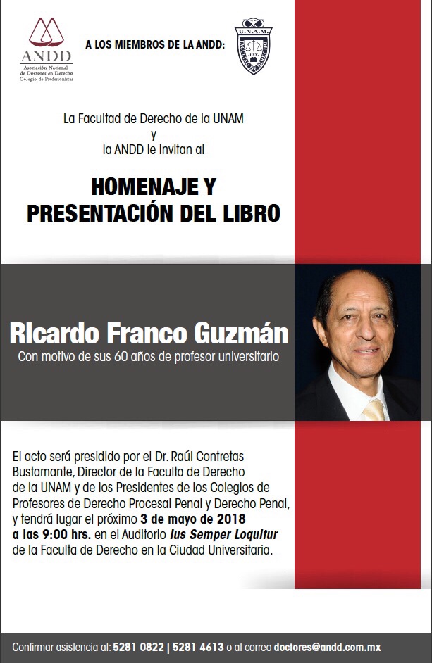 El próximo 3 de mayo a las 9:00, se llevará a cabo un merecido (pero insuficiente) homenaje al Dr. Ricardo Franco Guzmán en la Facultad de Derecho de la UNAM