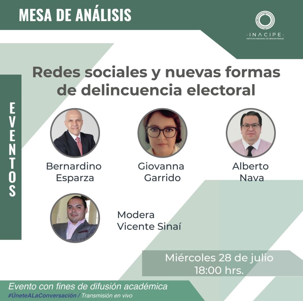 El 28 de julio de 2021 tuvo lugar en el INACIPE (modo virtual) una mesa de discusión sobre el alcance de las redes sociales, su impacto en las elecciones y su relación con los delitos electorales.
