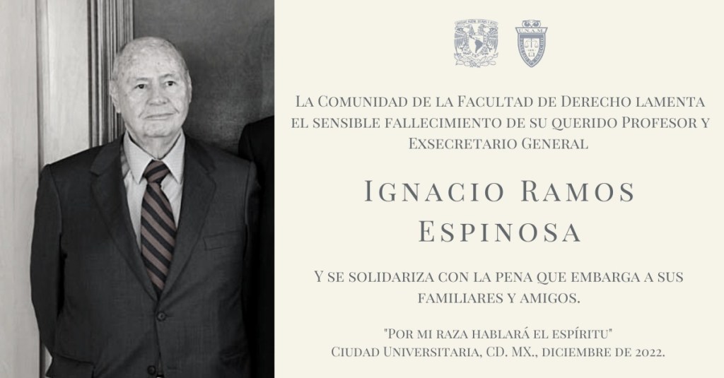 El 15 de diciembre de 2022, falleció Ignacio Ramos Espinosa, profesor de la Facultad de Derecho. Se trataba de un hacedor, ya que hacía posble que quienes estuvieran a su alrededor lograran cumplir distintas clases de metas. En lo personal, tuve la enorme fortuna de ser su alumno en su clase de Derecho Administrativo y que luego fuera mi jefe en la Dirección Jurídica de la Secretaría de la Reforma Agraria; que con una llamada lograra que yo tuviera un asesor en materia penal para dirigir mi tesis de licenciatura y que durante los siguientes treinta años fuéramos muy amigos y nos encontráramos con frecuencia y harto gusto en la sala de profesores de la Facultad o en las comidas anuales de la misma institución.